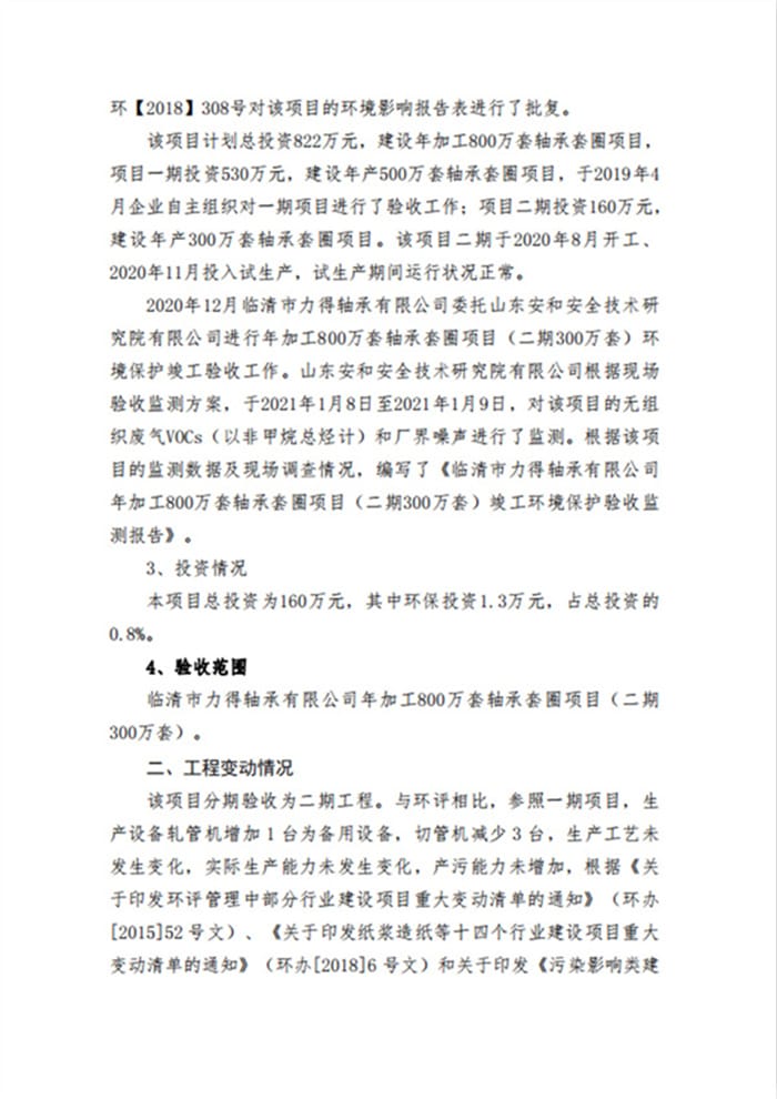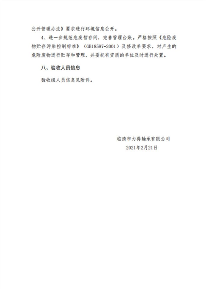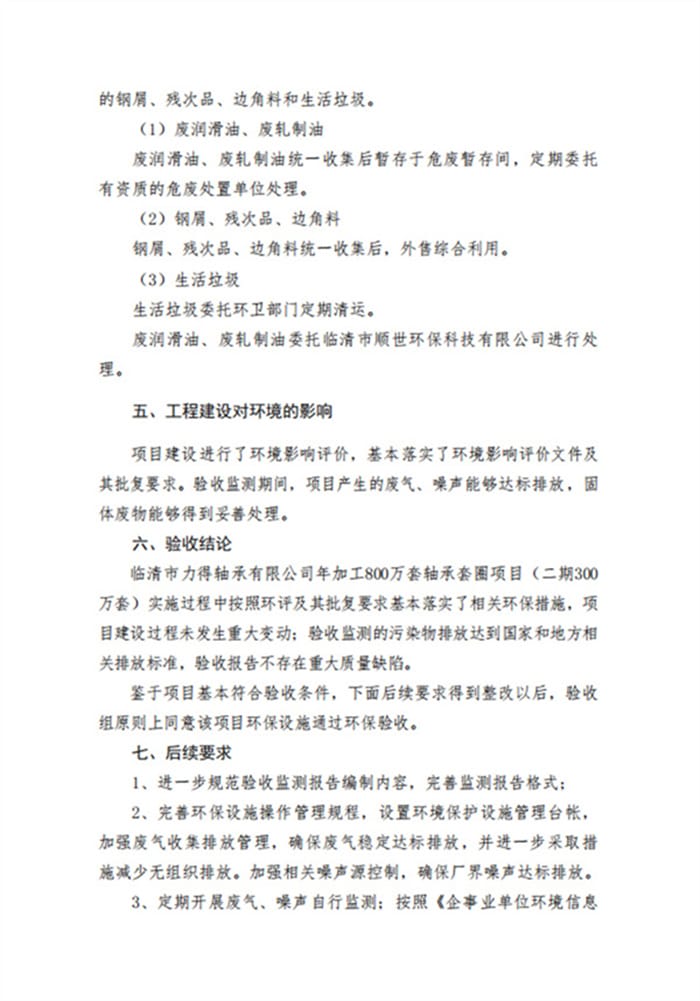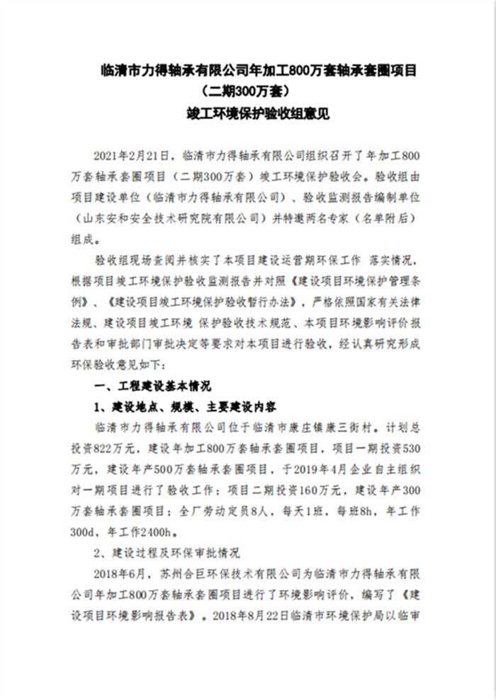 临清市力得轴承有限公司年加工800万套轴承套圈项目(二期300万套)验收转件签字、意见