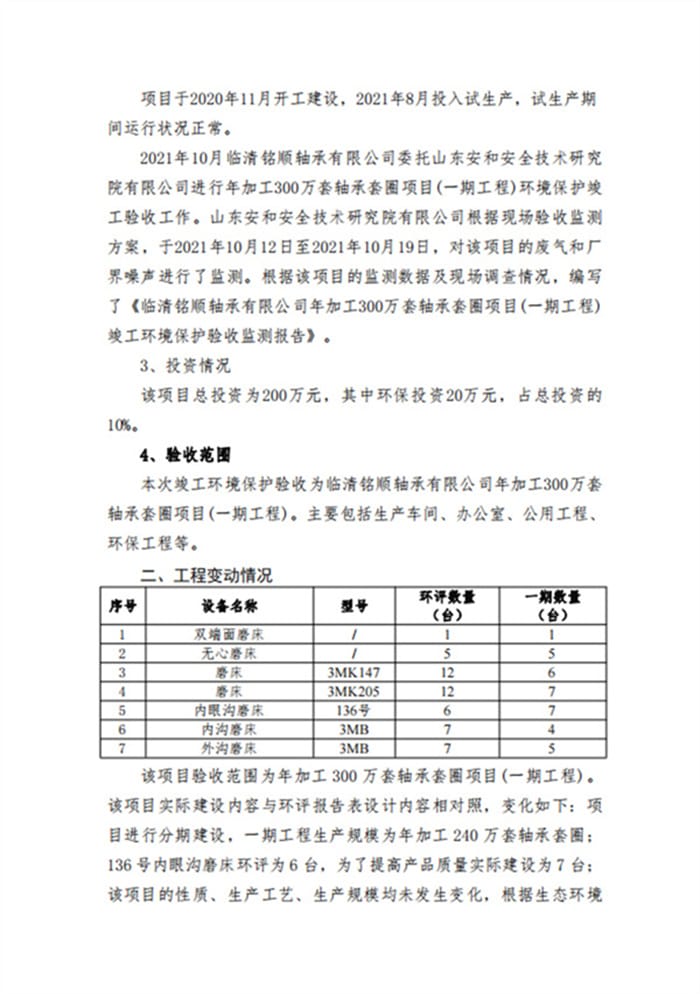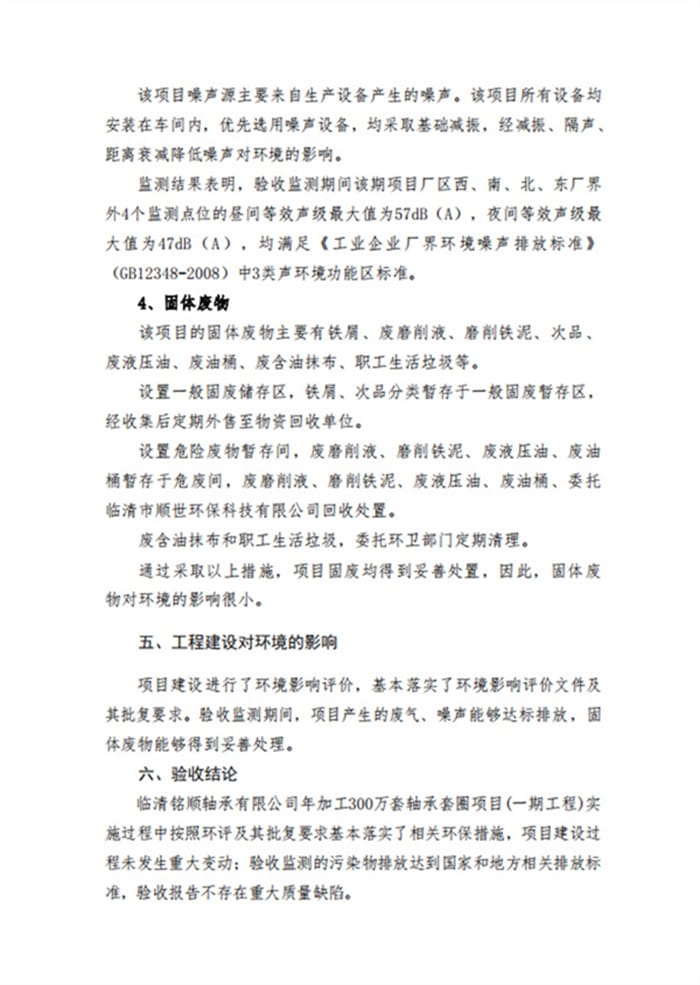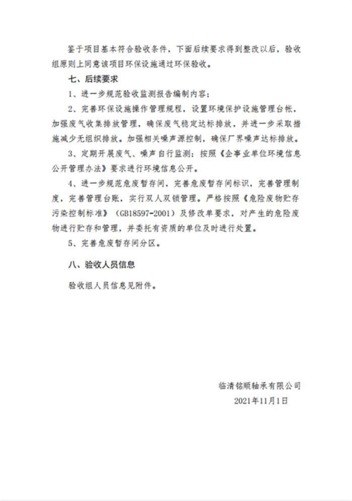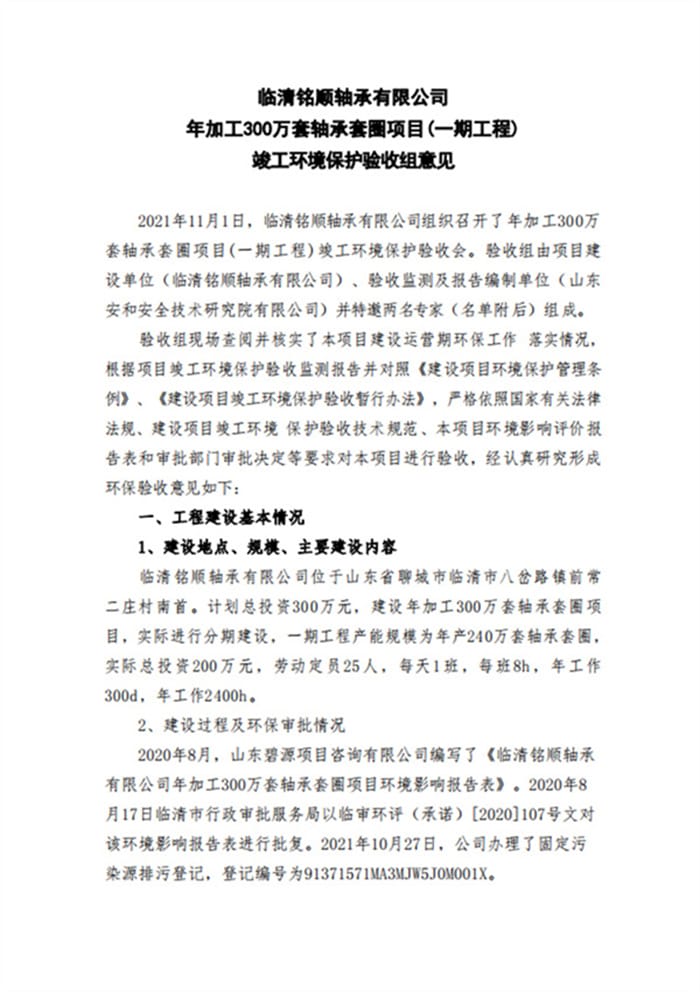 临清铭顺轴承有限公司年加工300万套轴承套圈项目(一期工程)专家验收意见和签字